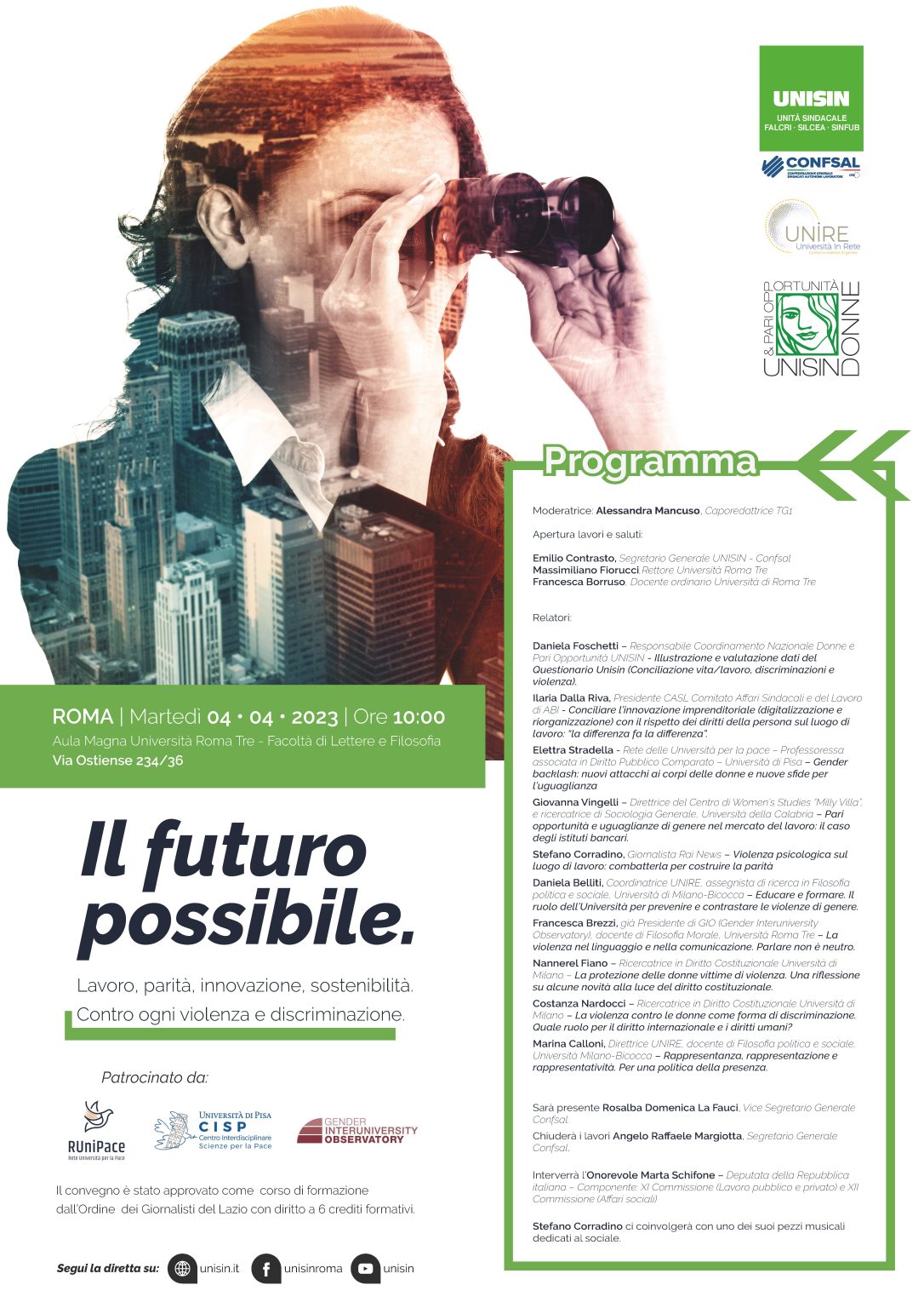Martedì 4 aprile 2023 alle ore 10:00 avrà luogo il convegno “Il futuro possibile. Lavoro, parità, innovazione, sostenibilità. Contro ogni violenza e discriminazione” presso l’Aula Magna della Facoltà di Lettere e Filosofia dell’università di Roma Tre.