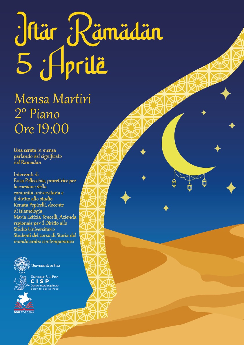 È in tale prospettiva che è stata organizzata nella data del 5 aprile, durante il periodo del Ramadan, una serata a mensa con studenti e docenti durante la quale parlare dell’importanza del digiuno (sawm) dall’alba al tramonto per la comunità musulmana, in collaborazione con il DSU e il CISP. Il momento del pasto serale che segna la rottura del digiuno (iftar) sarà l’occasione per approfondire il significato di una pratica che è considerata una dei cinque pilastri dell’Islam.