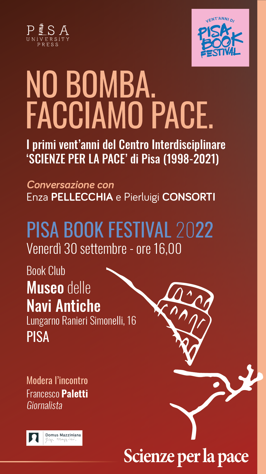 Venerdì 30 settembre, alle 16, al Museo delle Navi Antiche – Book Club, si svolgerà il secondo incontro: “No bomba. Facciamo la pace”.